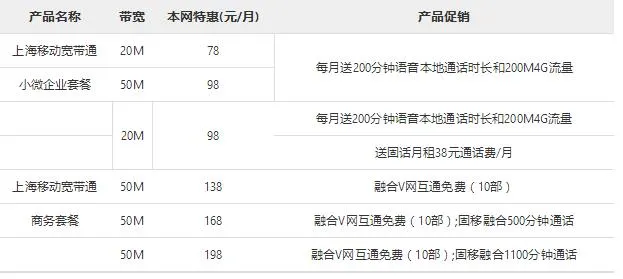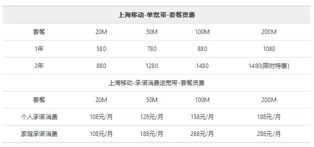 2017中国移动通信铁通宽带套餐内容价目表(以上海市为例子)